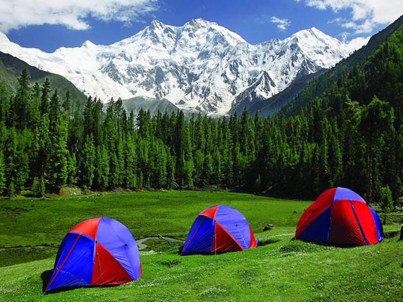 Fairy Meadows is approachable by a twelve kilometer-long jeep-able trek starting from Raikhot bridge on Karakoram Highway to the village Tato. Further from Tato, it takes about three to four hours hiking by a five kilometer trek to Fairy Meadows. The grassland is located in the Rakhiot valley, at one end of the Rakhiot Glacier which originates from the Nanga Parbat and feeds a stream that finally falls in the River Indus. Since 1992, locals have operated camping sites in the area. The six-month tourist season at Fairy Meadows starts in April and continues until the end of September. Tourists lodge at the camping site spread over 800 hectares (2 acres), known as “RakhiotSerai”.